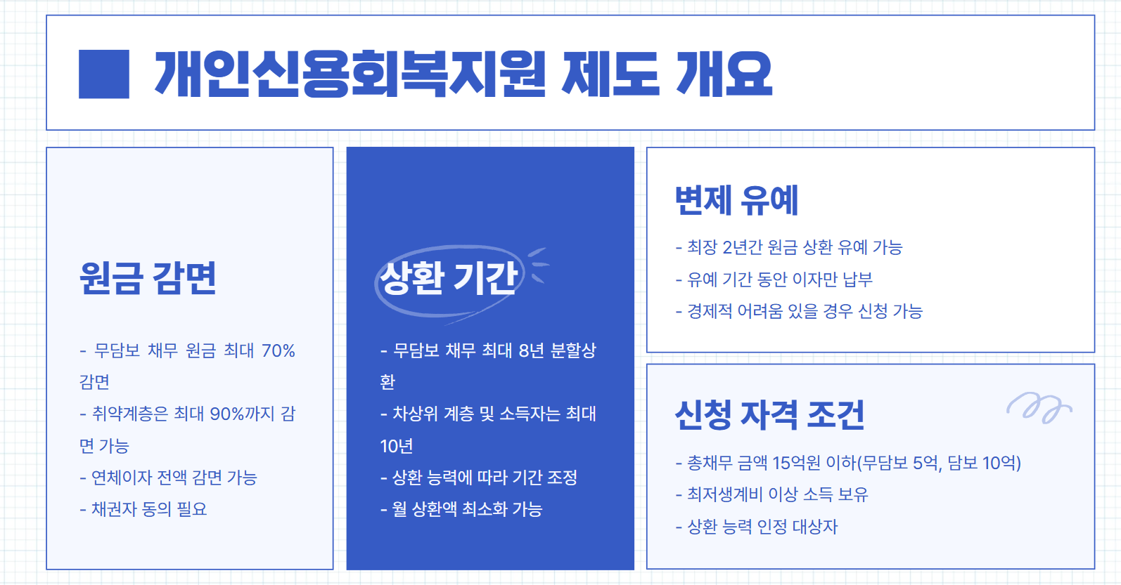 - 절차: 신청 → 심사 → 채권자 동의 → 채무조정협의서 체결 → 신용불량 정보 해제 easylaw.go.kr+3kdic.or.kr+3spot.wooribank.com+3