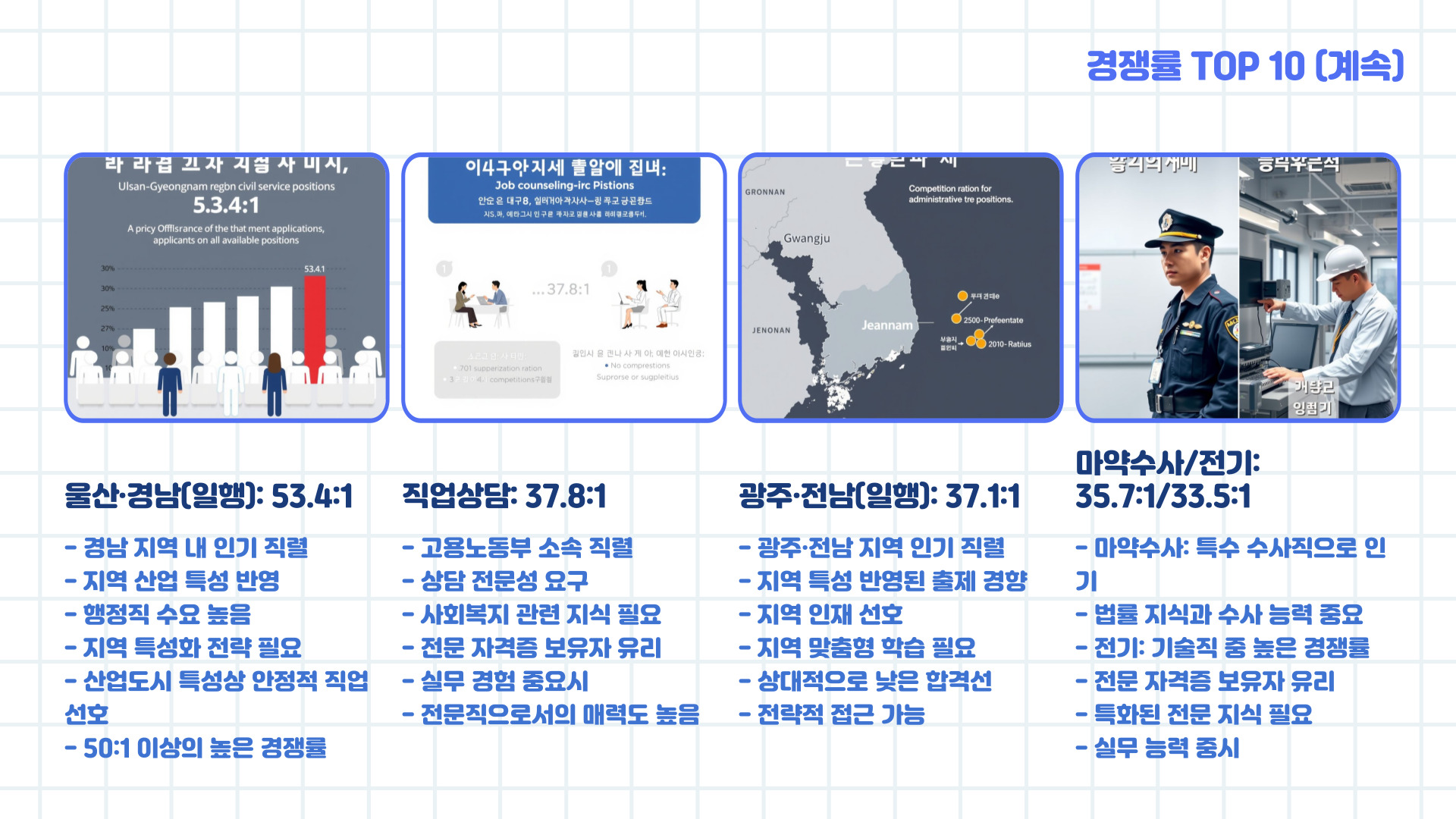 - 경쟁률 낮고 컷도 낮은 세무, 교정, 토목, 철도경찰 등 지원 시 안정적 접근 가능