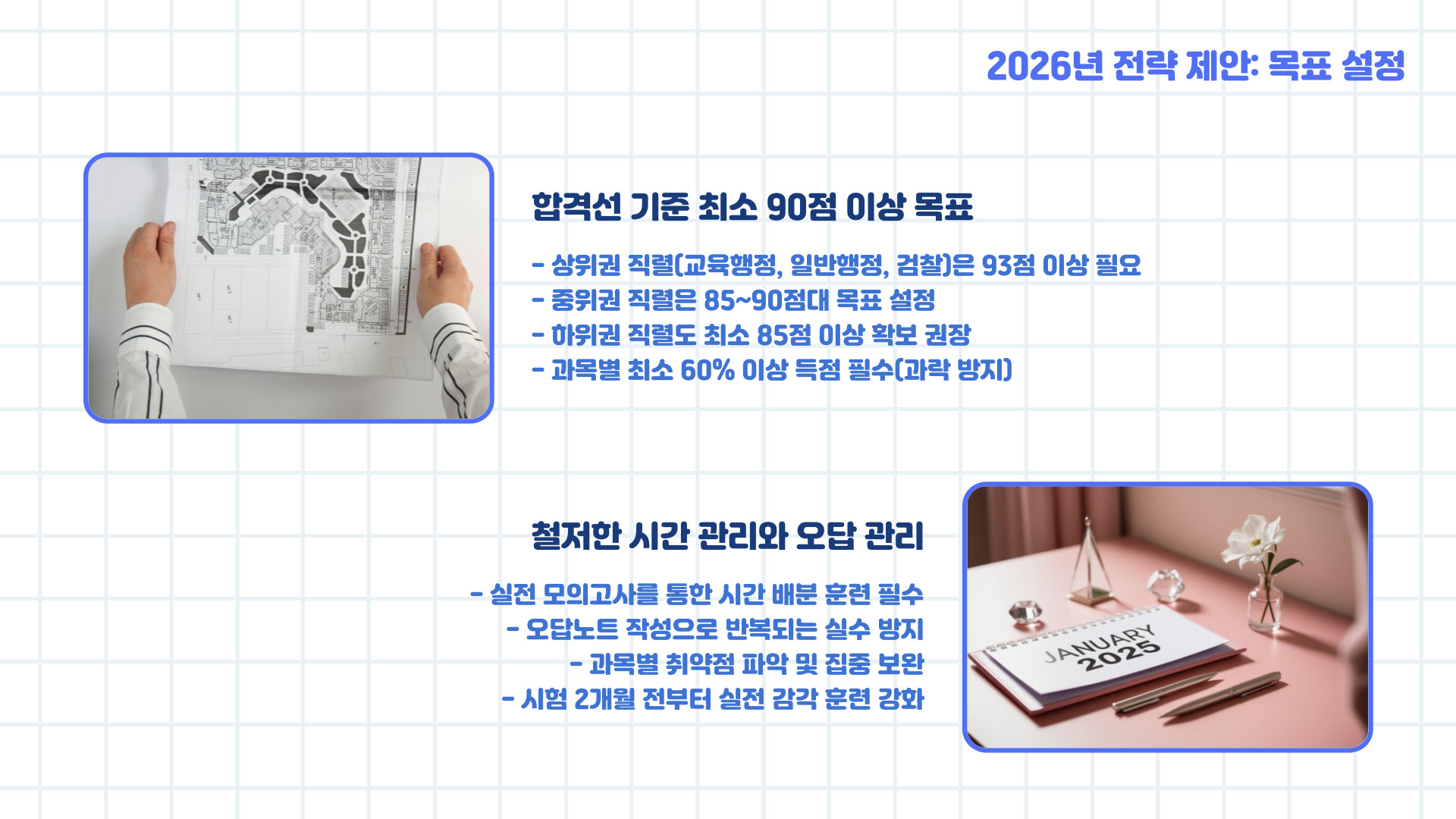 - 전국직/광역직은 컷이 높으므로 철저한 시간 관리 + 오답관리 필요